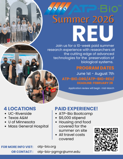 The NSF ATP-Bio REU is a 10-week research internship targeting STEM students nationwide, including community college students, who have not participated in prior research. Students will spend their summer doing exciting, cutting-edge research to help “stop biological time” and radically extend the ability to bank and transport cells, aquatic embryos, tissue, skin, whole organs, microphysiological systems (“organs-on-a-chip”), and even whole organisms through a team approach to build advanced biopreservation technologies.